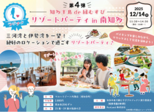 12月14日は南知多町のマルハリゾート内海店にてイベントを開催します。三河湾と伊勢湾を一望する絶景の中で、美味しいバイキングやゲームを通じて自然な交流をを楽しんでいただけます。参加者との縁、知多半島との縁をむすぶイベントにぜひご参加ください。
